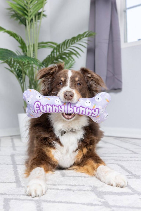 De funny bunny bone hondenspeeltje is een echte wannahave voor Pasen want welke hond is niet gek op een hondenbot!