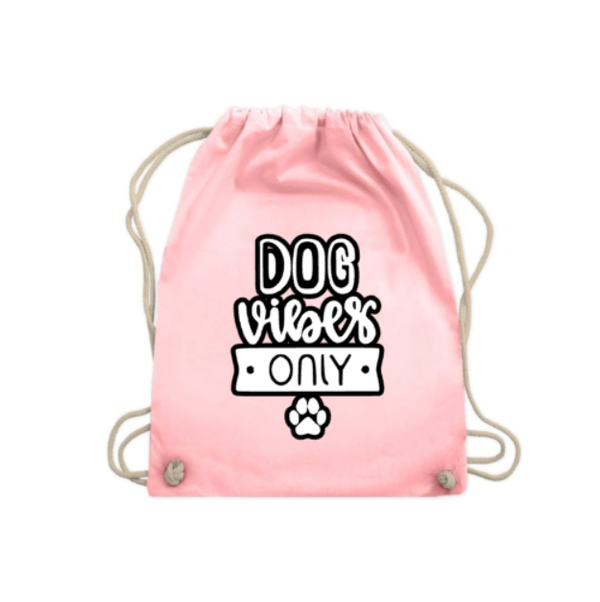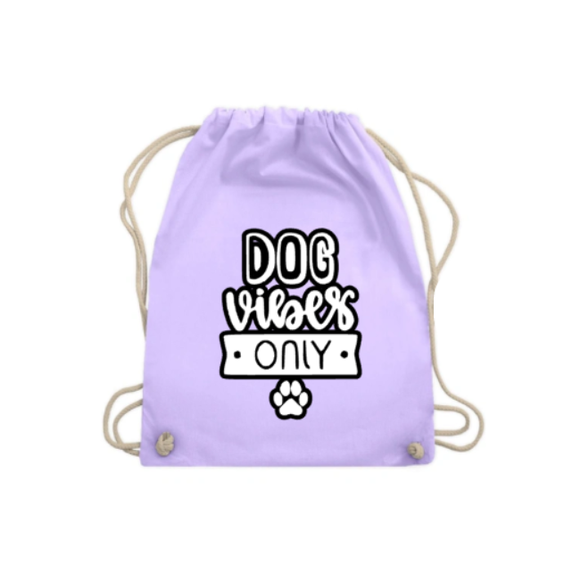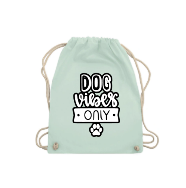 🔍 Zoekwoorden: dog vibes only trekkoordtas, gymbag met hondenquote, mint lila roze rugzak hond, personaliseerbare tas hond, zomerse hondenliefhebber tas, vrolijke hondentas