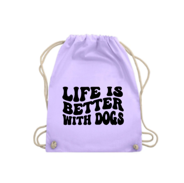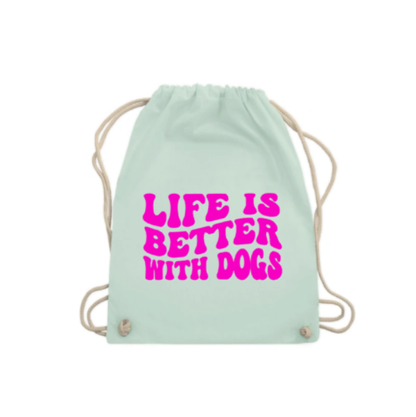 🔍 Zoekwoorden: life is better with dogs trekkoordtas, gymbag hondenquote, rugzak hond mint lila roze, personaliseerbare honden tas, zomerse tas hondenliefhebber, dog mom rugzak