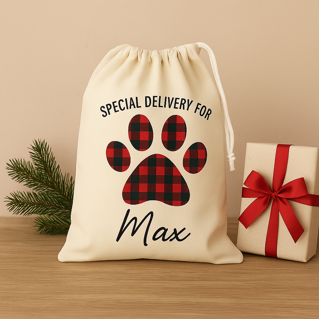 Het is pas echt een kerstfeest als iedereen inclusief jouw huisdier voorzien is van een vrolijke gepersonaliseerde kerstcadeau zak.