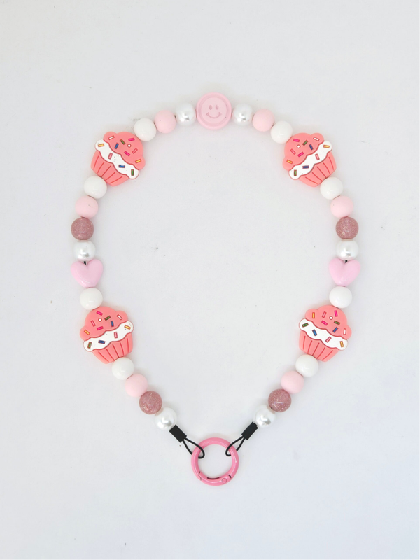 Deze feestelijke hondenketting is gemaakt met 12 mm kralen in prachtige roze tinten, aangevuld met schattige cupcakekralen die perfect passen bij elke verjaardagsviering.
