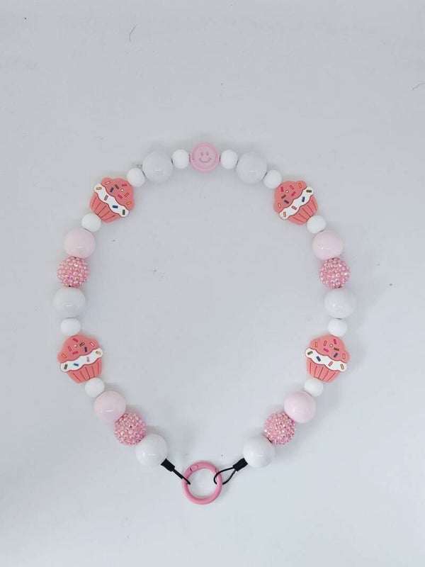 Deze prachtige 20 mm bubblegum ketting combineert zachte witte en roze tinten met schattige roze cupcake-kralen voor die heerlijke, feestelijke sweet celebration uitstraling.