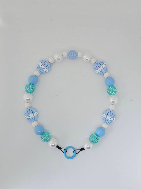 Deze prachtige 20 mm bubblegum ketting bestaat uit een mix van heldere blauwtinten en frisse witte kralen, afgewisseld met schattige blauwe cupcakekralen voor een vrolijke, feestelijke uitstraling.